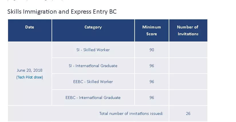 加拿大当地时间2018月6月20日,BC省移民局公布新一轮技术移民(仅针对32个特快审批职业)抽选情况:本轮抽选共计发出26份邀请,常规雇主担保类分数线上涨至90分,其它类别分数线上涨至96分。